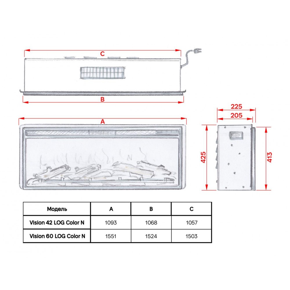 Надана серія камінів має моделі 2-х діагоналей: 42 (1093x426x225 мм) та 60 дюймів (1556x426x225 мм).
